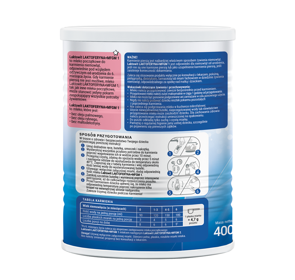 Jeśli dziecko nie jest karmione piersią, Laktowit LAKTOFERYNA+MFGM 1, tak jak inne mleka początkowe, może stanowić jedyny pokarm zaspokajający wszystkie potrzeby żywieniowe. Także do dokarmiania.