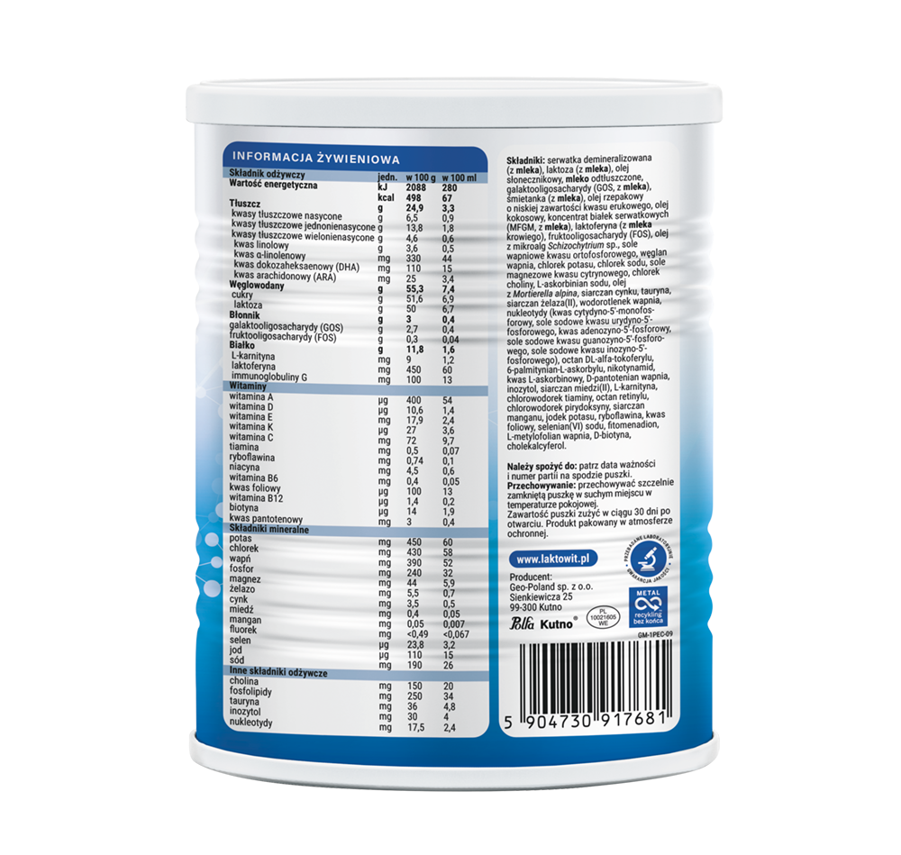 Laktowit, to najstarsza polska marka mleka dla niemowląt, która zadebiutowała na rynku w latach 70tych XX wieku. Kilka lat temu udało nam się przejąć markę Laktowit z powrotem w polskie ręce (kliknij i poznaj pełną historię mleka Laktowit). Jako Geo-Poland, mamy już 30 lat doświadczenia w branży żywienia niemowląt. Lata zdobywania wiedzy, praktyki i umiejętności oraz zaplecze specjalistów w dziedzinach medycznych, żywienia i technologii pozwoliło stworzyć naszą unikalną formułę Laktowit LAKTOFERYNA+MFGM.Pamiętaj: karmienie piersią jest najlepszym sposobem żywienia niemowląt. Zaleca się wyłączne karmienie piersią dzieci do 6. miesiąca życia.